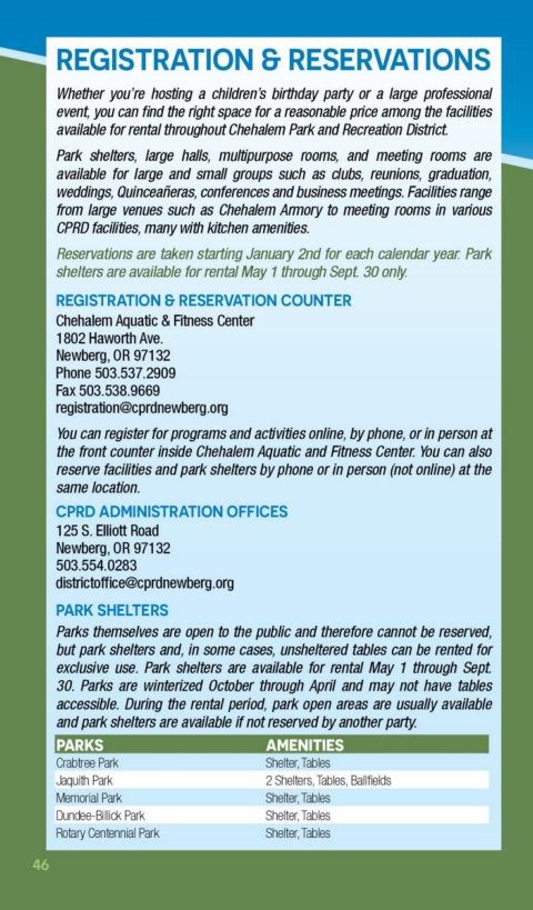 available for rental throughout Chehalem Park and Recreation District.